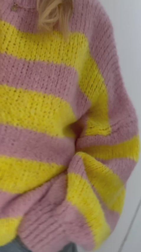 Flauschiger Pullover mit rosa-gelben Streifen. Superweich, kuschelig und angenehm zu tragen. Der lockere Schnitt sorgt für einen lässigen Look – perfekt für gemütliche Tage und stylische Alltagsoutfits.